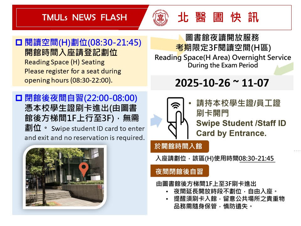 考試期間圖書館3F(信義校區)閱讀空間彈性24小時開放