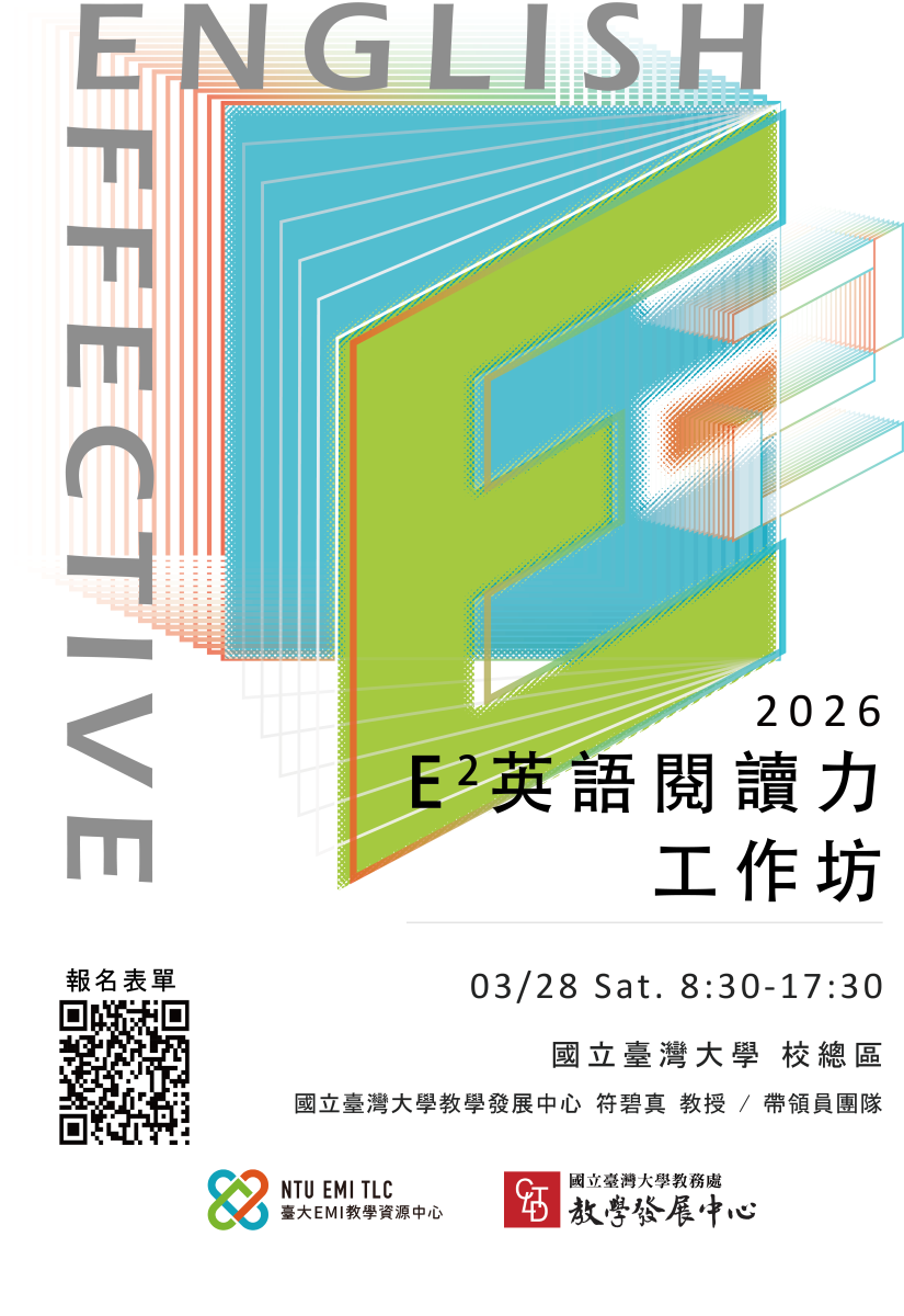 E2 英語閱讀力工作坊,由國立臺灣大學教發中心(CTLD)與EMI教學資源中心(EMI TLC)共同舉辦,旨在引導學生採用SQ3R的閱讀策略,包括Survey (瀏覽全文結構及邏輯順序)、Question (針對文章各層次的標頭提出Wh- 的問題)、Read(根據Wh- 的問題,閱讀文章並找答案)、Recite(複述各層次Wh- 問題與答案)、Review(複習全文架構,以及問題與答案)。希望學生work smart,短時間能夠掌握文章重點,達到事半功倍的效果。